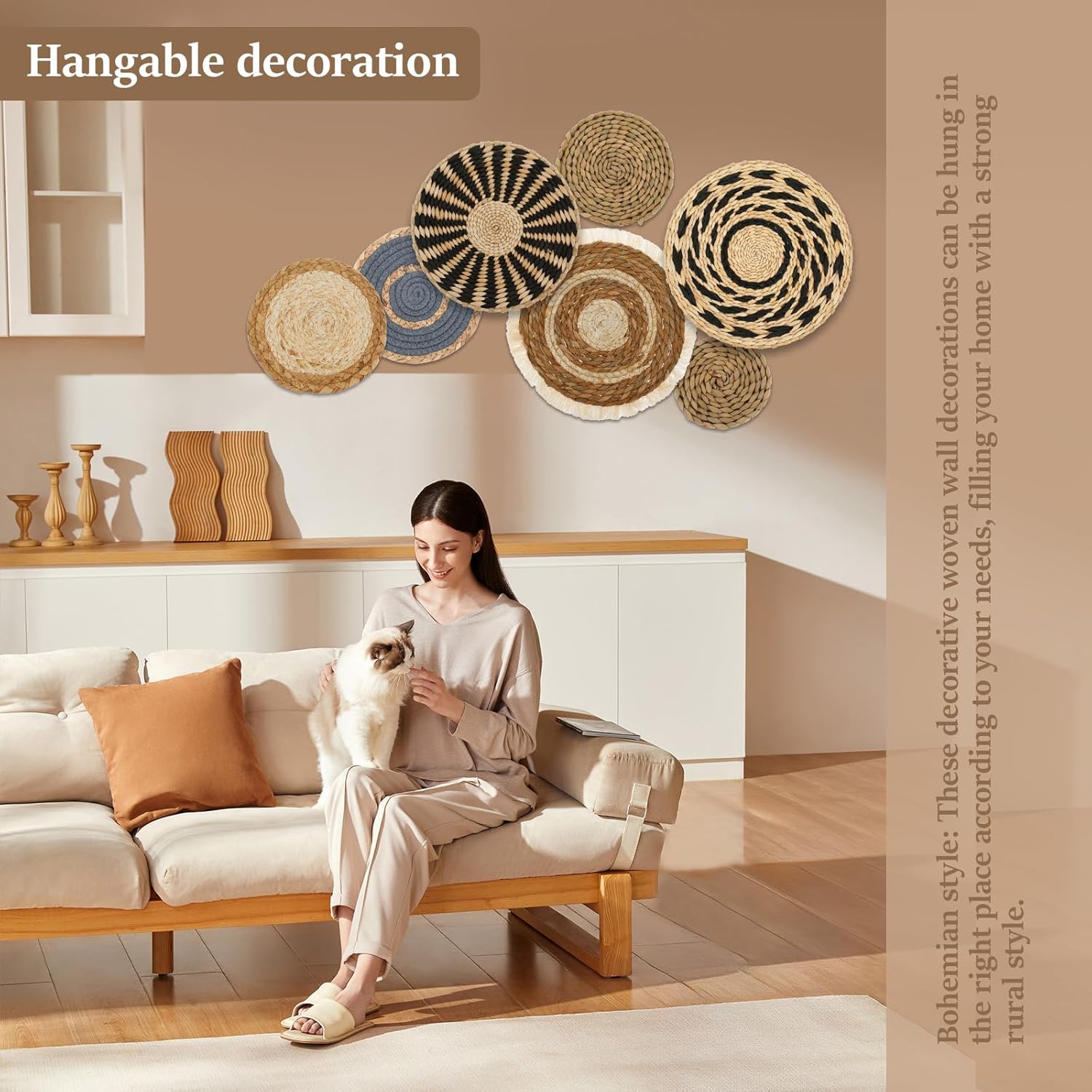 8 reviews for 7 Pack Boho Wall Basket Decor Set, Hanging Woven Seagrass Rattan Wicker Boho Wall Decor, Round Farmhouse Wall Hanging Baskets Rustic Flat Wall Art for Living Room Bedroom Kitchen