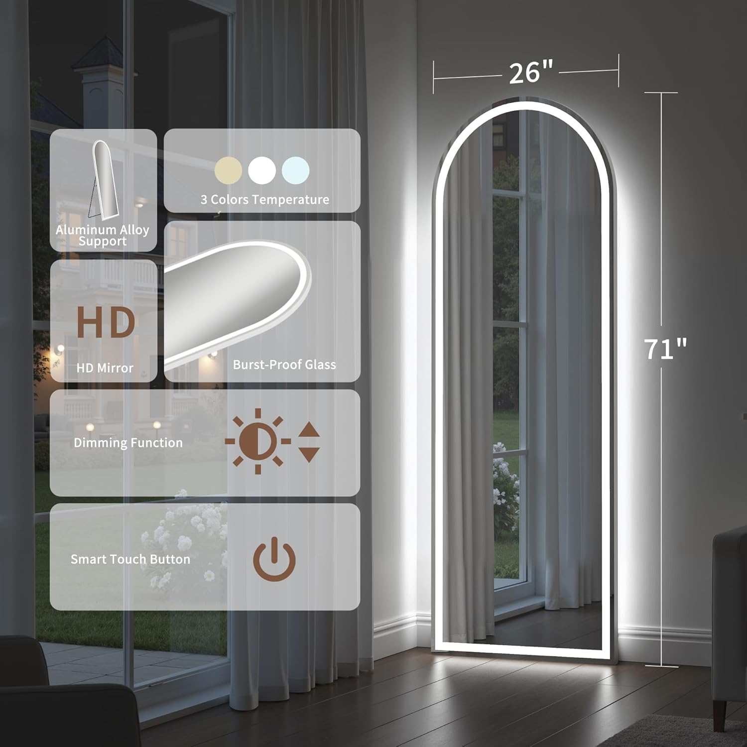 8 reviews for 71″ x 26″ Arched Full Length Mirror with LED Lights, Floor Mirror with Stand, Wall Mirrors Full Length, Body Floor Mirrors, Wall Mounted for Bedroom, Dimmable, Tempered Glass