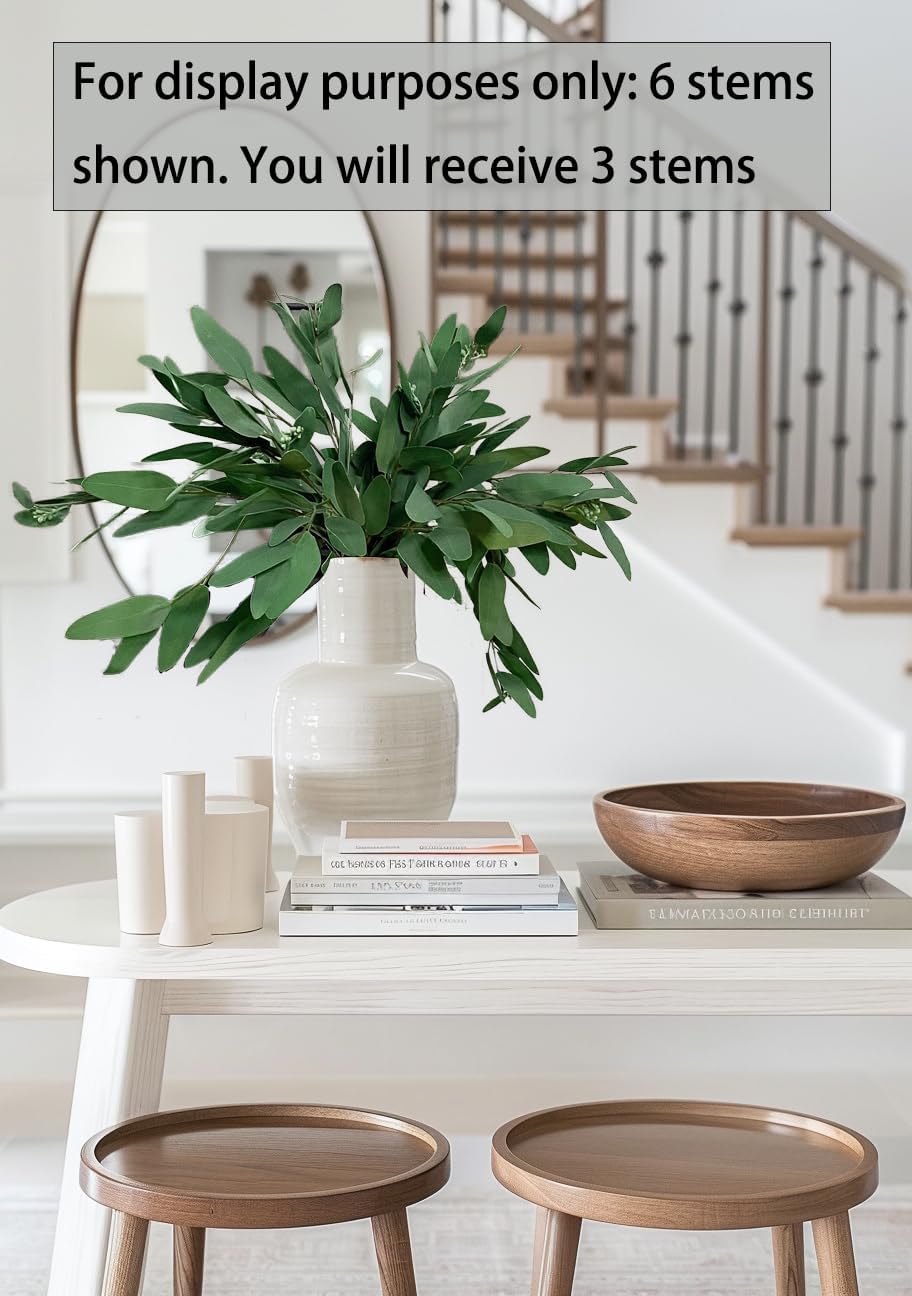 Product Quantity: This listing includes 3 eucalyptus stems. Some images may show more stems to demonstrate possible arrangements and provide styling inspiration. For a fuller look, multiple sets may be required.Display and Decoration: Please note that vases and other decorative items shown in some photos are not included. These items are used to show how our eucalyptus stems can be creatively arranged in your home.Styling Considerations: The images showing larger bouquets are intended to inspire you to create beautiful arrangements by combining multiple sets. The appearance of the stems may vary depending on how they are styled.