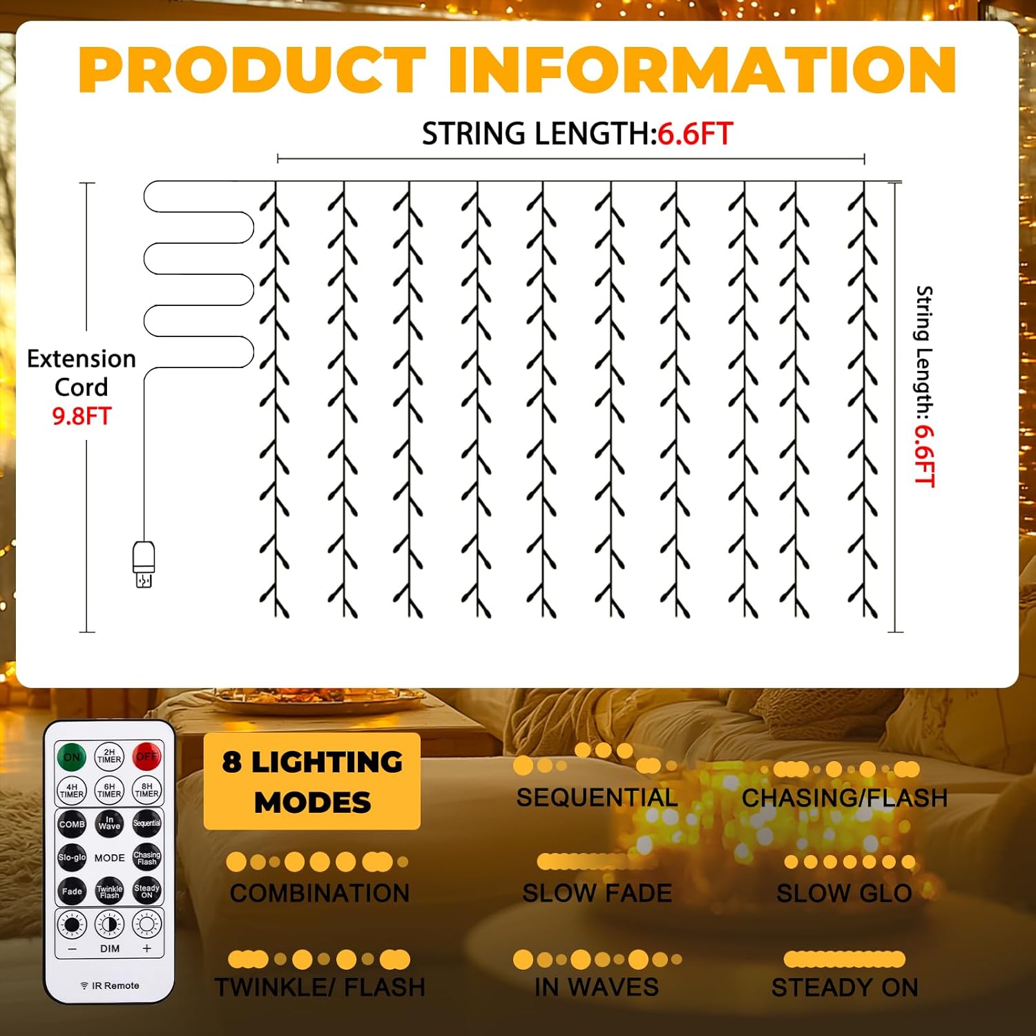 Tangle-Free Curtain Lights: 200 super bright LED bulbs, the 6.6×6.6Ft curtain lights come with a 9.8Ft extension cord; With 10 drop light strings, each holding 20 LEDs, and convenient hooks at the top for easy hanging, they effortlessly add warmth and sparkle to any room, creating a dreamy, fairytale ambiance that fills your space with joy and serenity