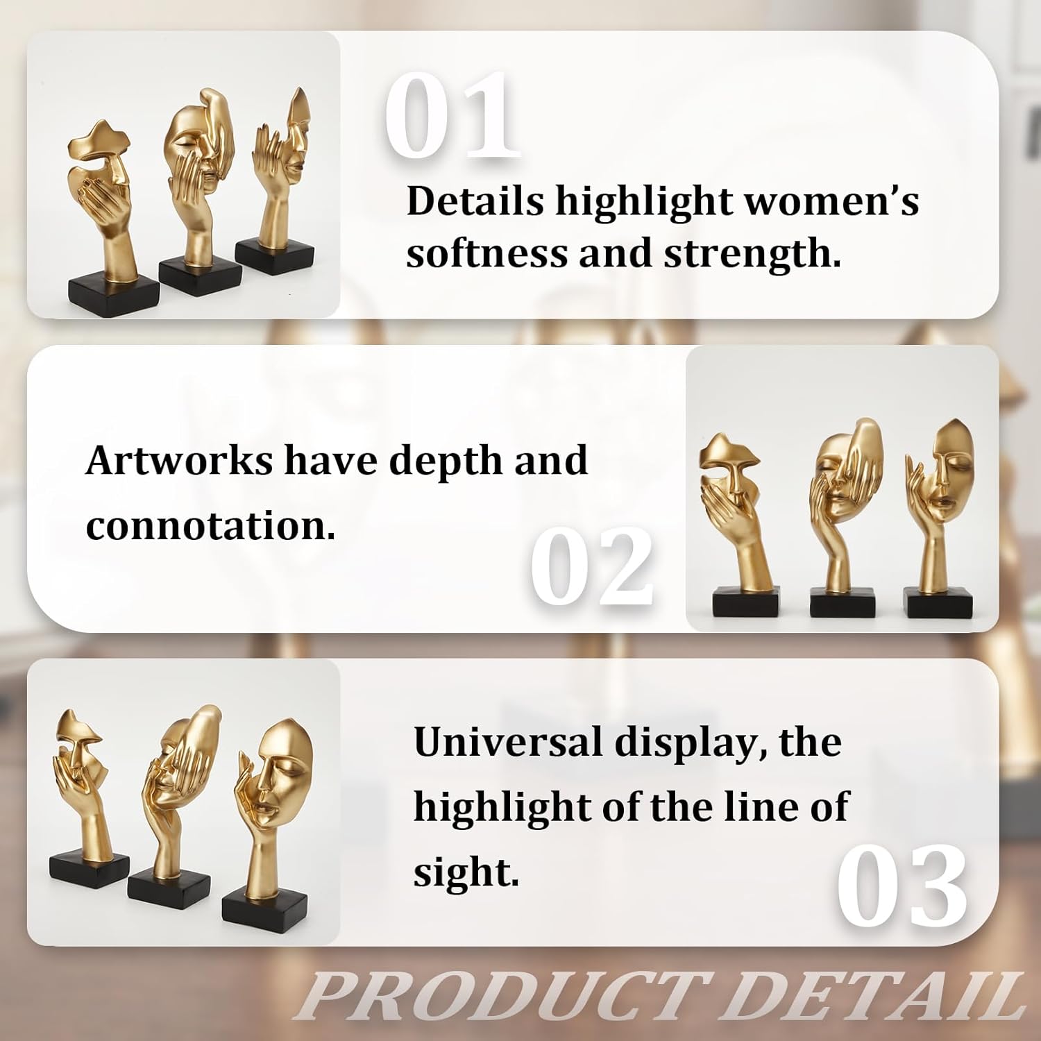 {The Combination of Art and Spirit}: This set of three female face sculptures combines the inspiration and spiritual connotation of modern art. Gold and black are intertwined to create a sculpture experience that people can’t help but want to admire.