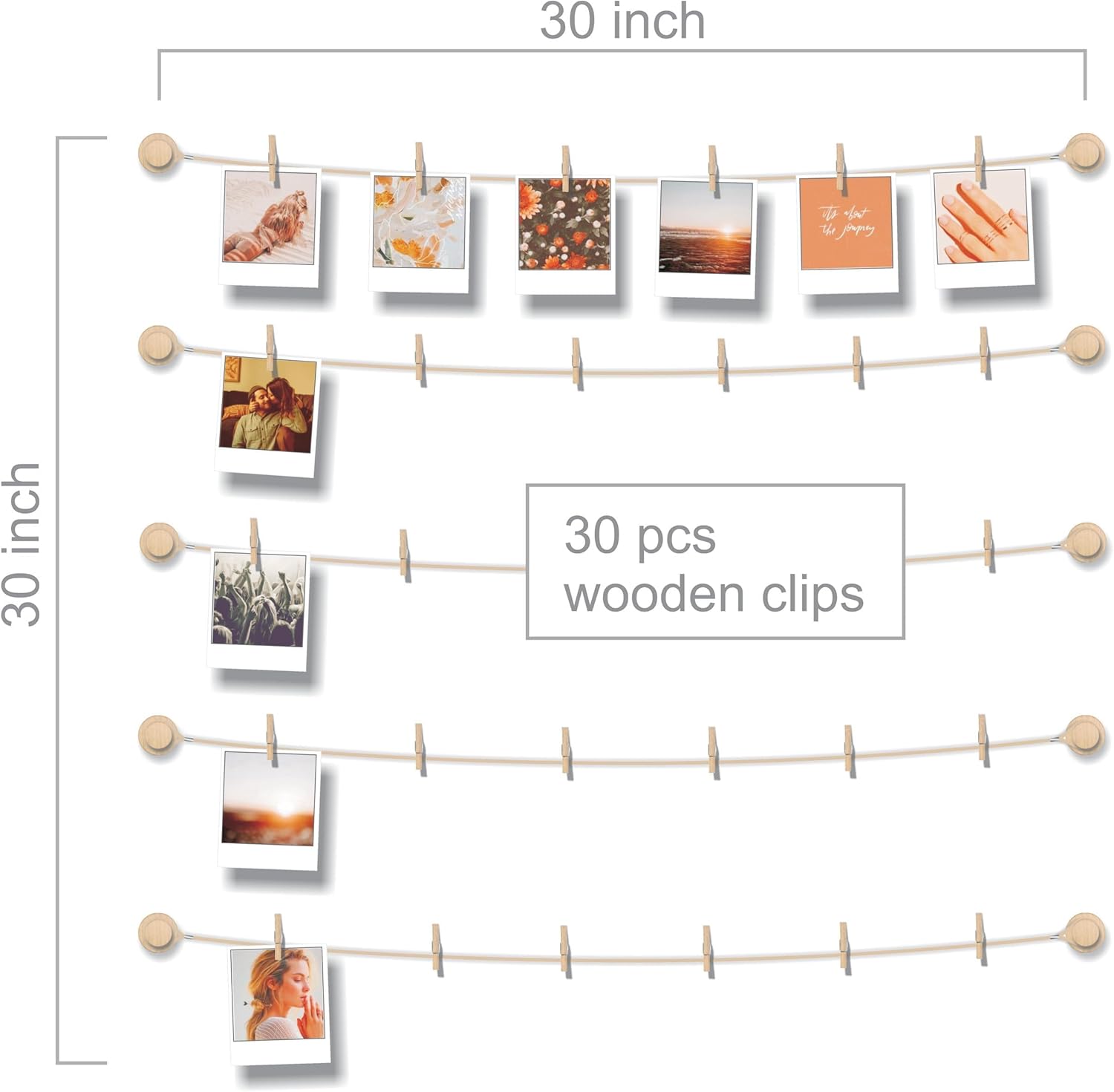 11 reviews for Hanging Photo Display Room Wall Decor – Sculptural Picture Frames Collage – 5 Strings with 30 Clips – 3M Self Adhesive Hooks – No Holes Drilling – 30 x 30 inch