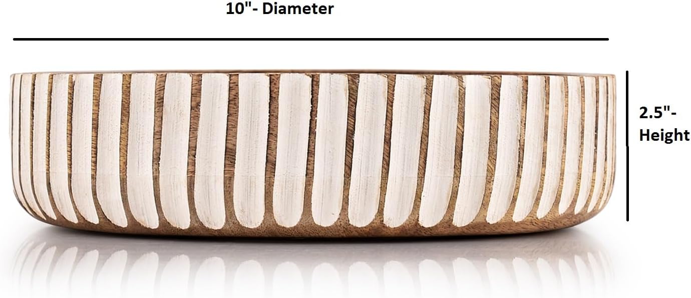 These unique bowls are made from durable and Mango Wood that is perfect for any decor. Use them to hold fruit, serve salads, or just to decorate around your home. The distinguished details of the basin are a real eye-catcher and turn the wooden Bowl into an outstanding piece of art, it decorates any hallway, room, office, or entry. The decorative interior accessory can be used as a design piece to store keys, jewelry, seasonal decorations Additionally, the wooden bowl can be used to decoratively display fruit in the kitchen or living room.