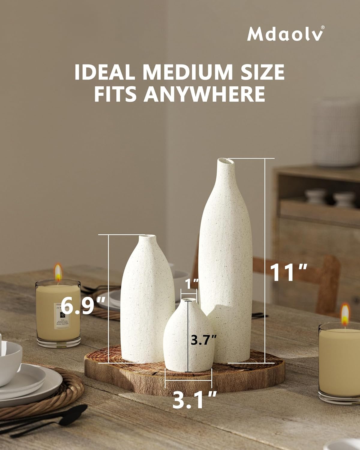 “Simple Ceramic Vase Set of 3 – Create a Balanced, Layered Focal Point” Minimalist cylindrical shape matte glazes modern clay vases for home decor, Size (11’’H x 3.1’’L) x (6.8’’H x 3.1’’L) x (3.7’’H x 3.1’’L) bottle mouth 1’’ With 3 sizes that create a balanced focal point through graduated heights, this set adds layered style to your home. Ideal for table decor, mantel and fireplace displays, entryway console, coffee table, kitchen island, and dining table centerpieces.