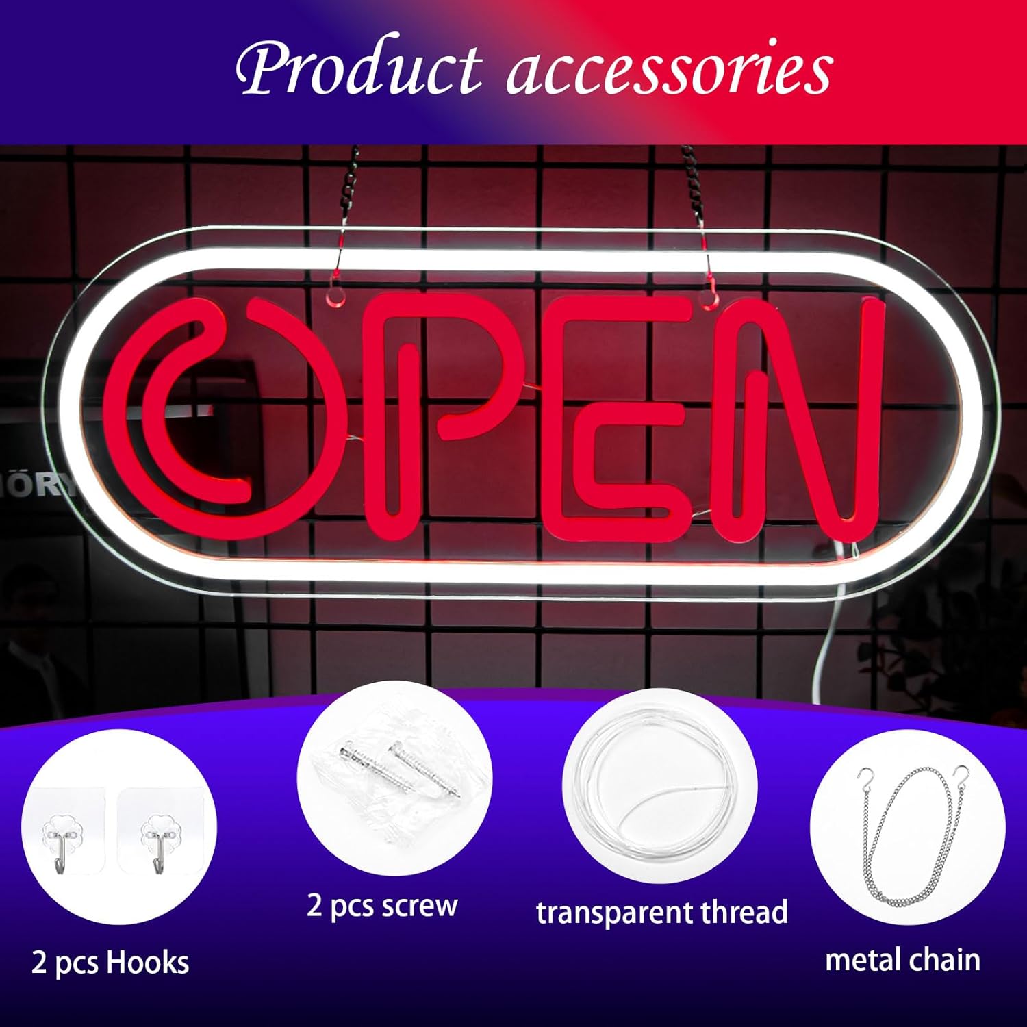 Easy to Install: Our open neon sign package includes an expansion screws*2, 80cm suspension chain*1, and strong sticky hooks*2, a 78.74 in foot long USB port power cord. There are two pre-drilled holes on acrylic backboard for easy hanging anywhere you want to display, then plug in and turn on the switch, and your storefront window will instantly light up with a dazzling new sign.