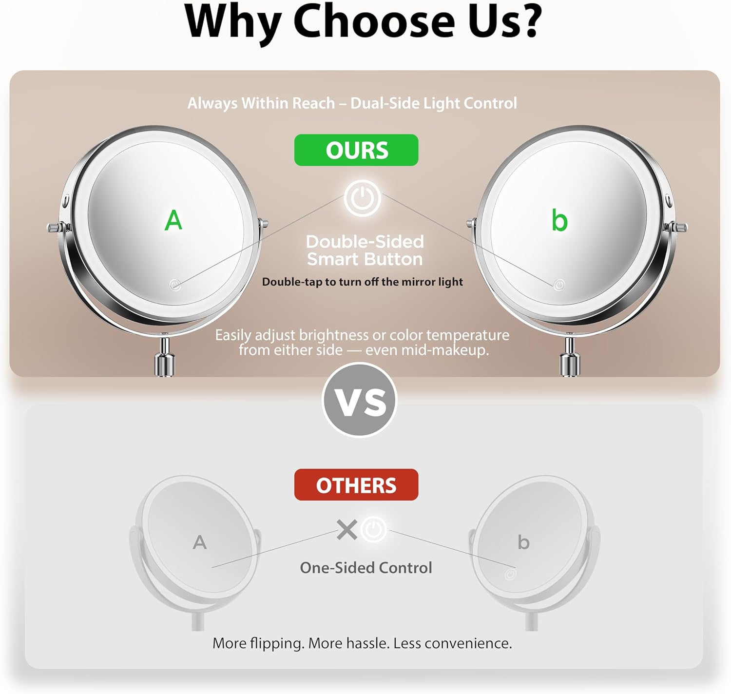 Dual Switch Control – Lights On Both Sides for Your Convenience: Unlike ordinary mirrors with light on only one side, our upgraded version features independent touch switches on both 1X and 30X sides, allowing effortless control of brightness no matter which side you’re using. *Note:Simply double-tap the mirror surface to instantly turn off the light.