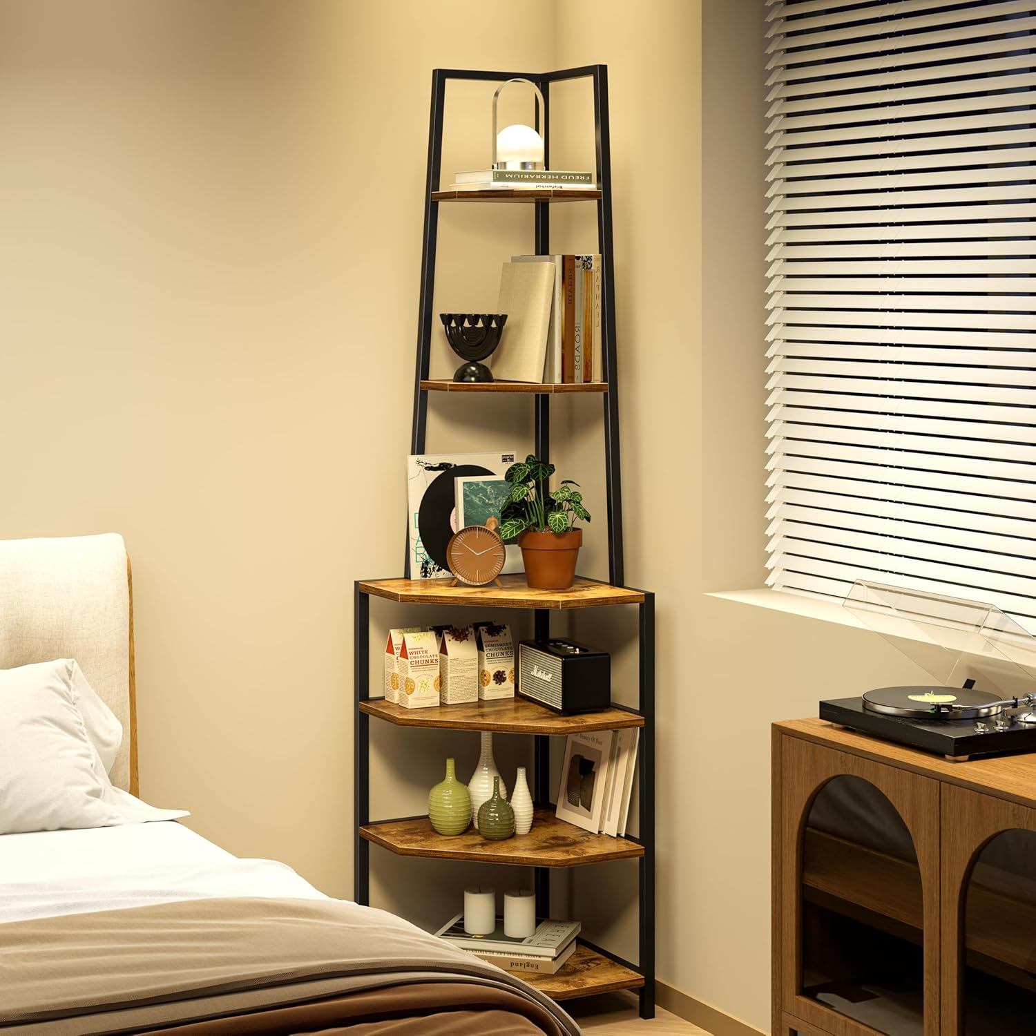 11 reviews for VECELO 6 Tier Corner Shelf 69 Inch Industrial Bookshelf with Metal Frame, Multipurpose Tall Plant Stand with Opening Display Shelves for Living Room, Bedroom, Home Office, Small Space, Brown